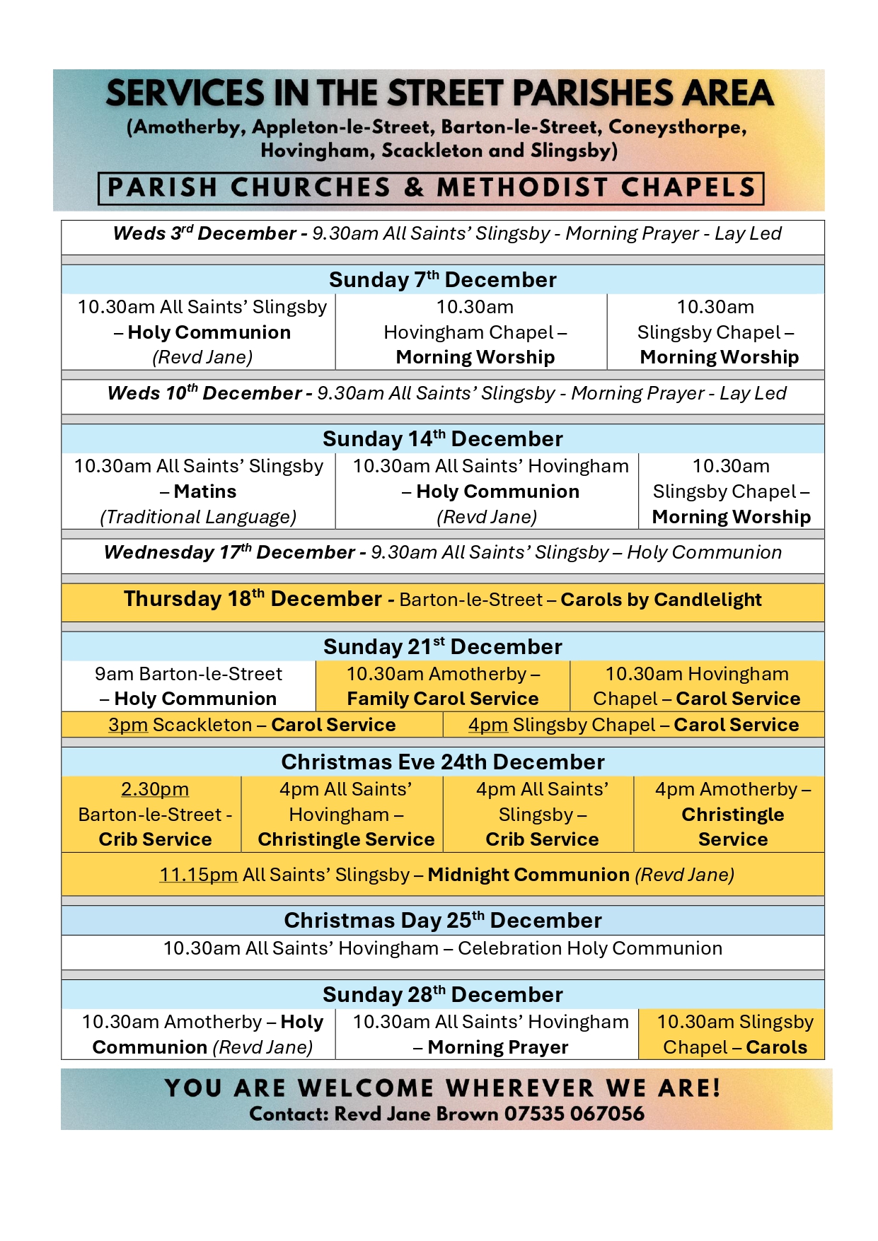 Our next service is on Sunday 29th December at 10:30am and will be led by Revd Jane. Please join us for this service of Holy Communion.
